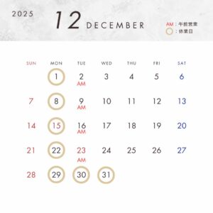 月曜日定休日の他、4(火)PM、11(火)PM、14(金)AM、18(火)PM、25(火)PMを休業いたします。